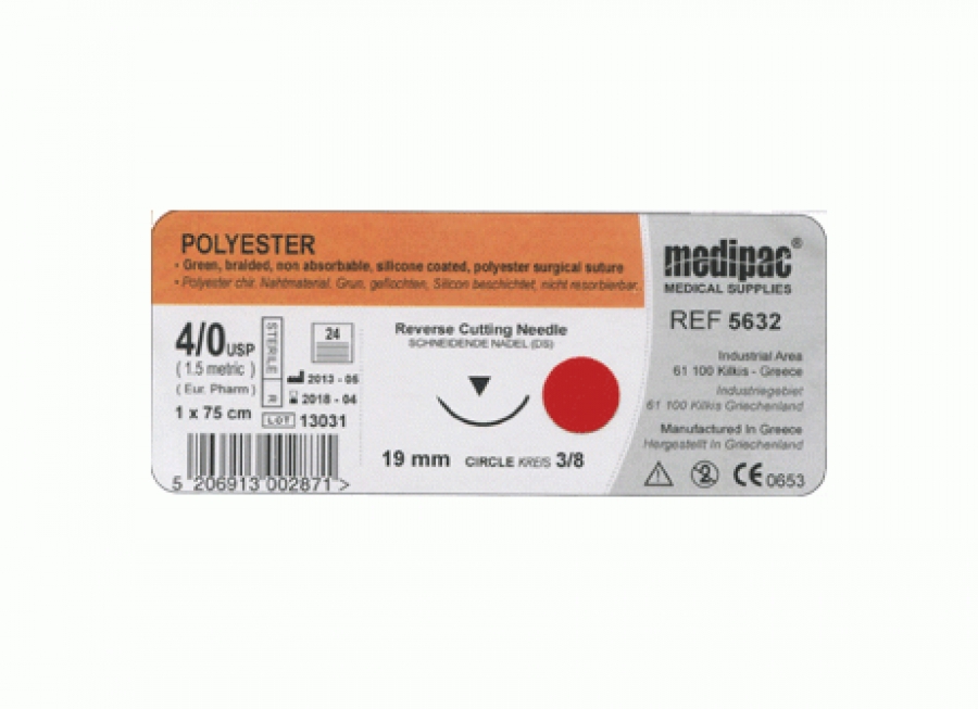 Mη απορροφήσιμο χειρουργικό ράμμα POLYESTER 4.0 μήκους 45cm με βελόνα 12mm κόπτουσα 3/8 του κύκλου (5612). Χρησιμοποιείται για την συγκράτηση σε επαφή και την σύγκλιση μαλακών ιστών, ακόμη και σε καρδιαγγειακές, νευρολογικές και οφθαλμολογικές επεμβάσεις.