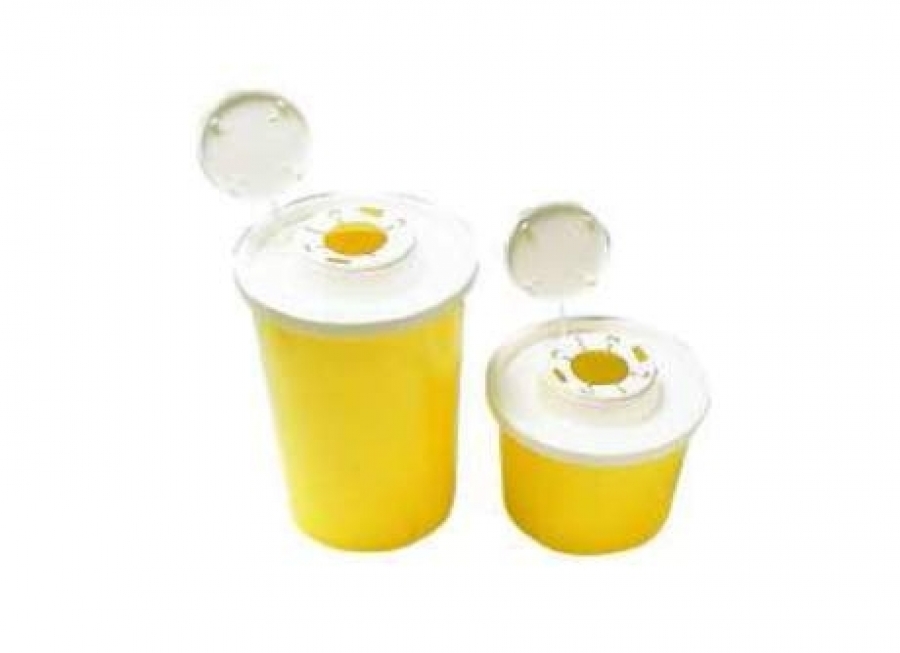Πλαστικό δοχείο για την απόρριψη βελονών και εν γένει αιχμηρών αντικειμένων. Διαθέσιμο σε δύο διαστάσεις: